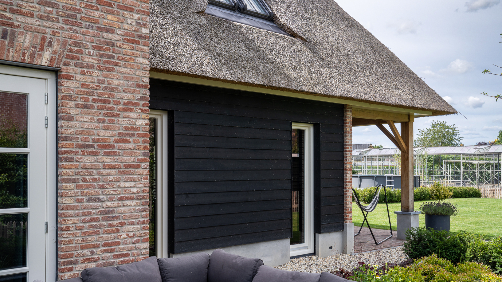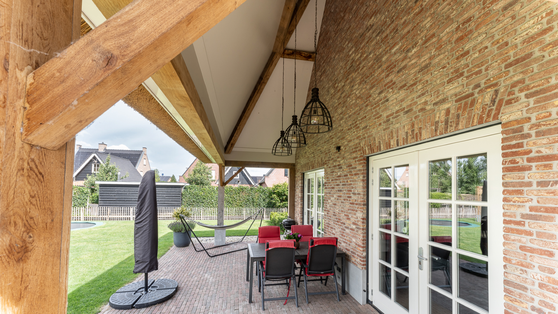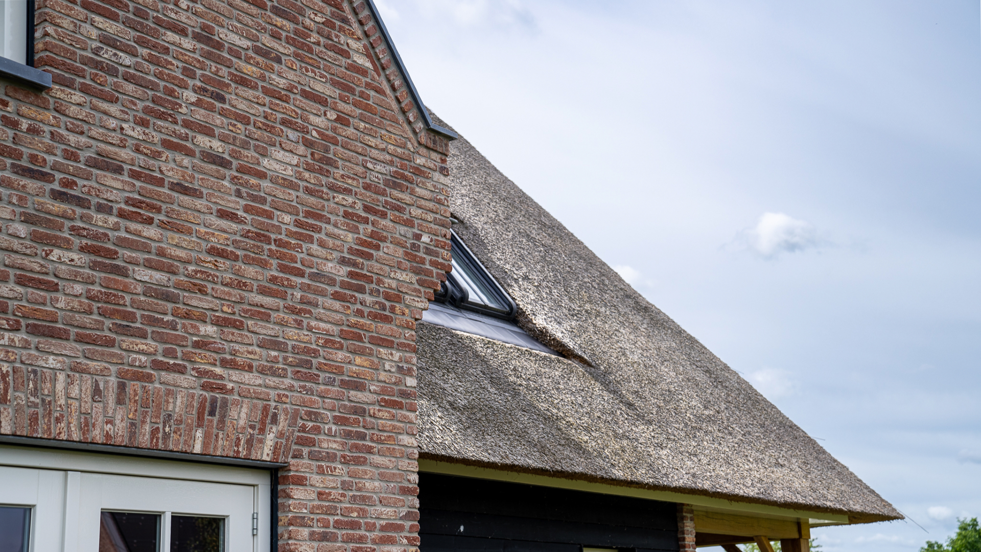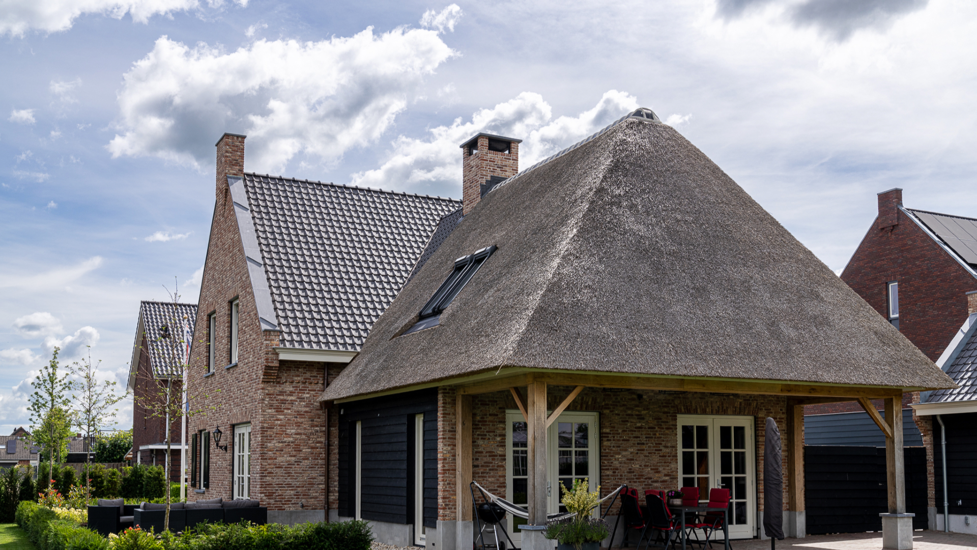 De combinatie van een rieten kap en klassieke dakpannen geeft de woning een uniek en luxe karakter. Het contrast tussen beide materialen zorgt voor een speels én harmonieus geheel. Binnen is de villa voorzien van alle ruimte en comfort, volledig afgestemd op de wensen van de bewoners.