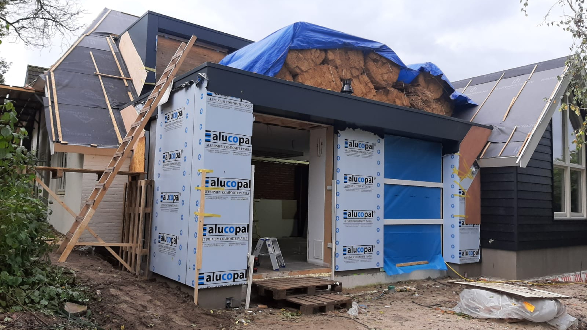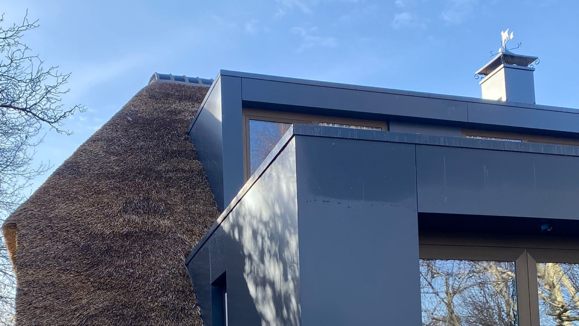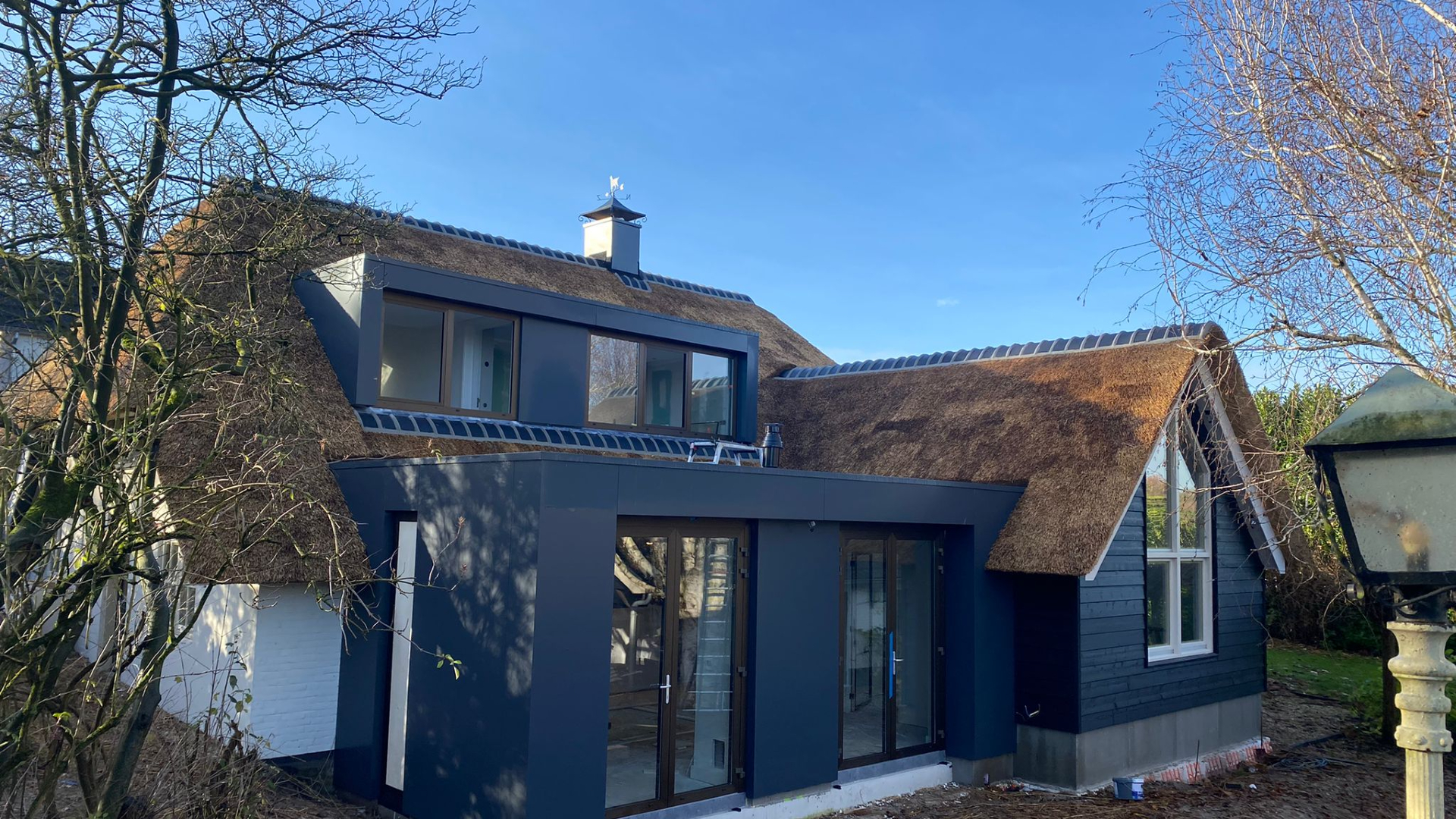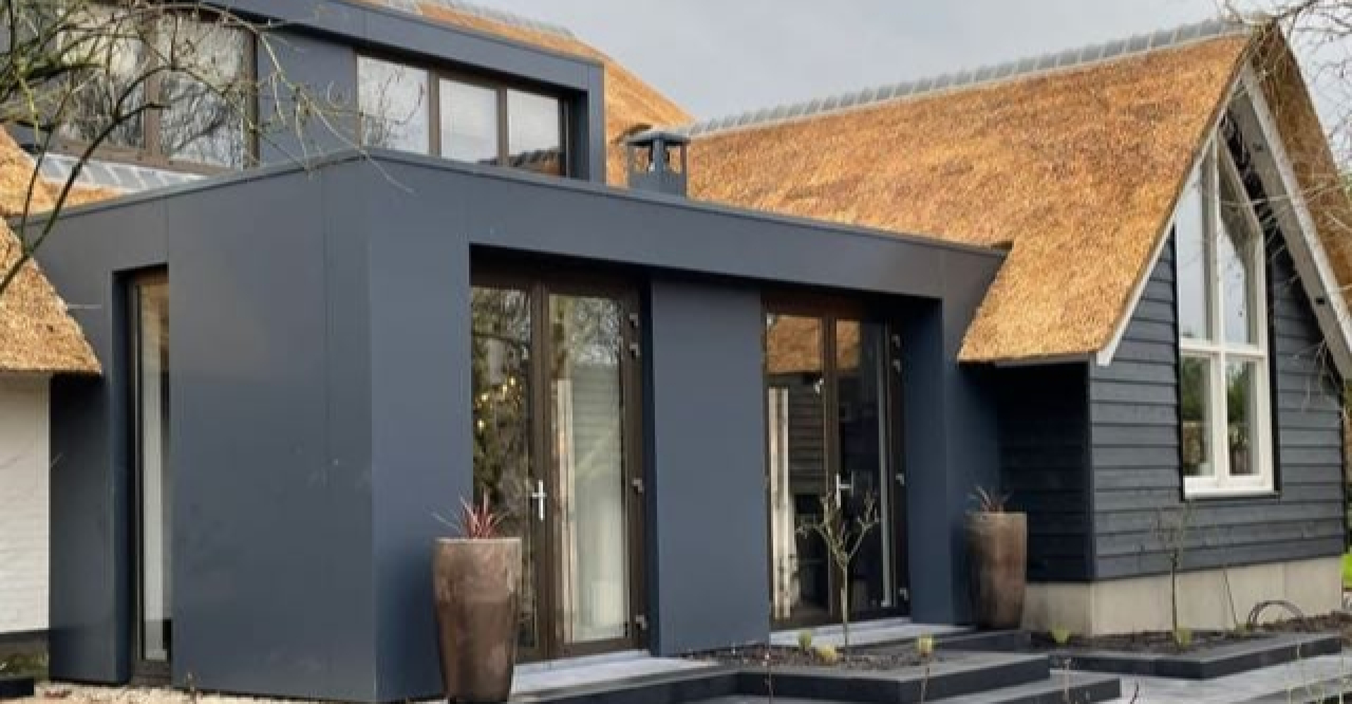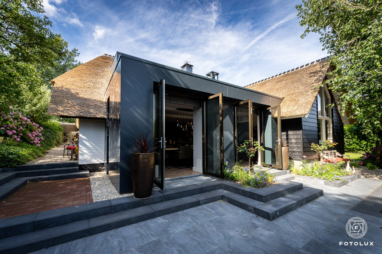 De boerderij is in z’n oude glorie herstelt en tegelijkertijd vergunningvrij uitgebreid met een uitbouw en dakkapel. De uitbouw is voorzien van de strakke gevelbekleding Alucopal van Plastica. En die vormt dan weer een perfect contrast met de bronskleurige aluminium kozijnen van de schuifpui.