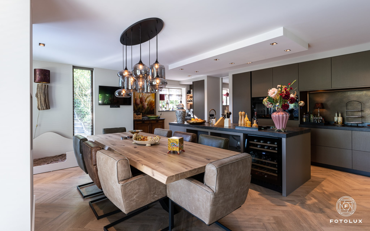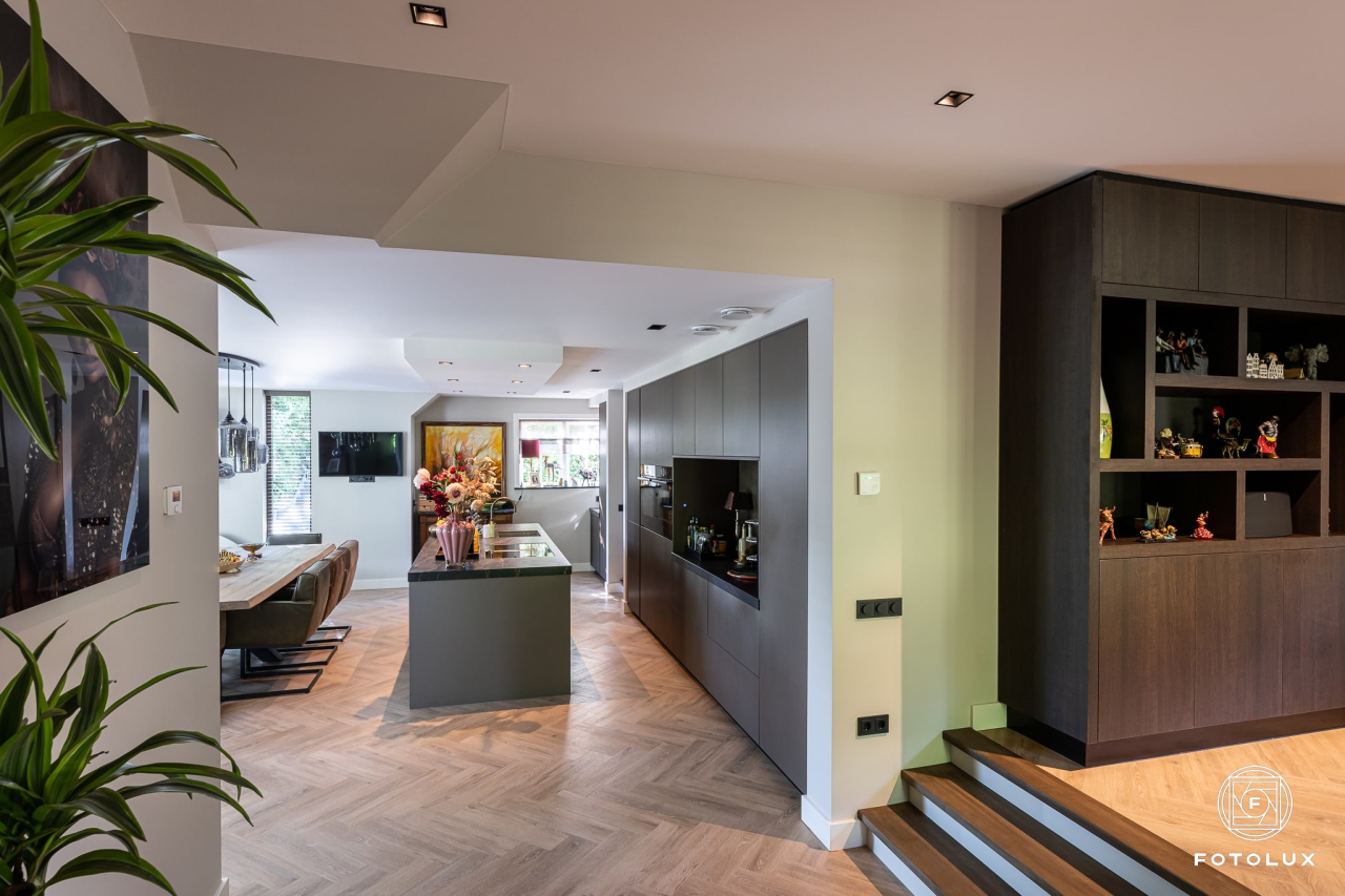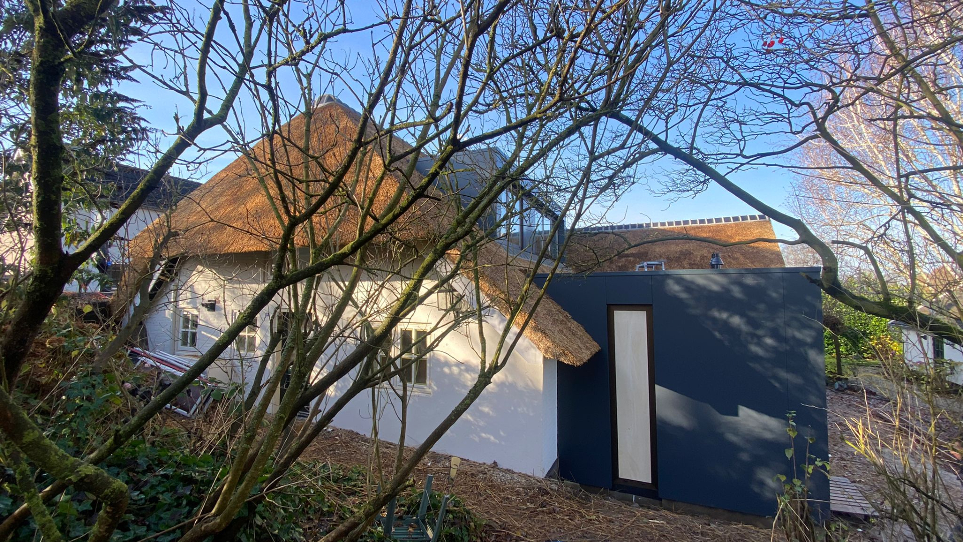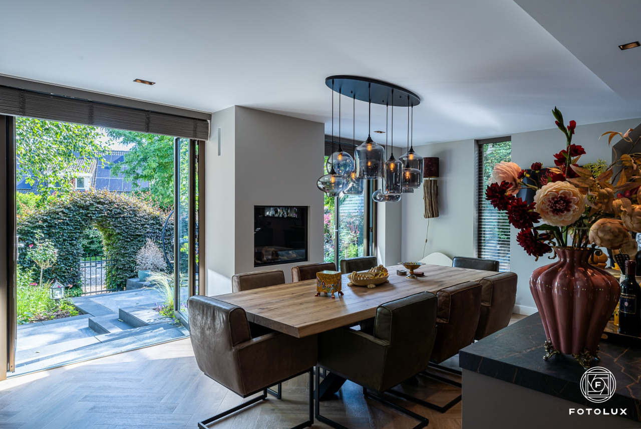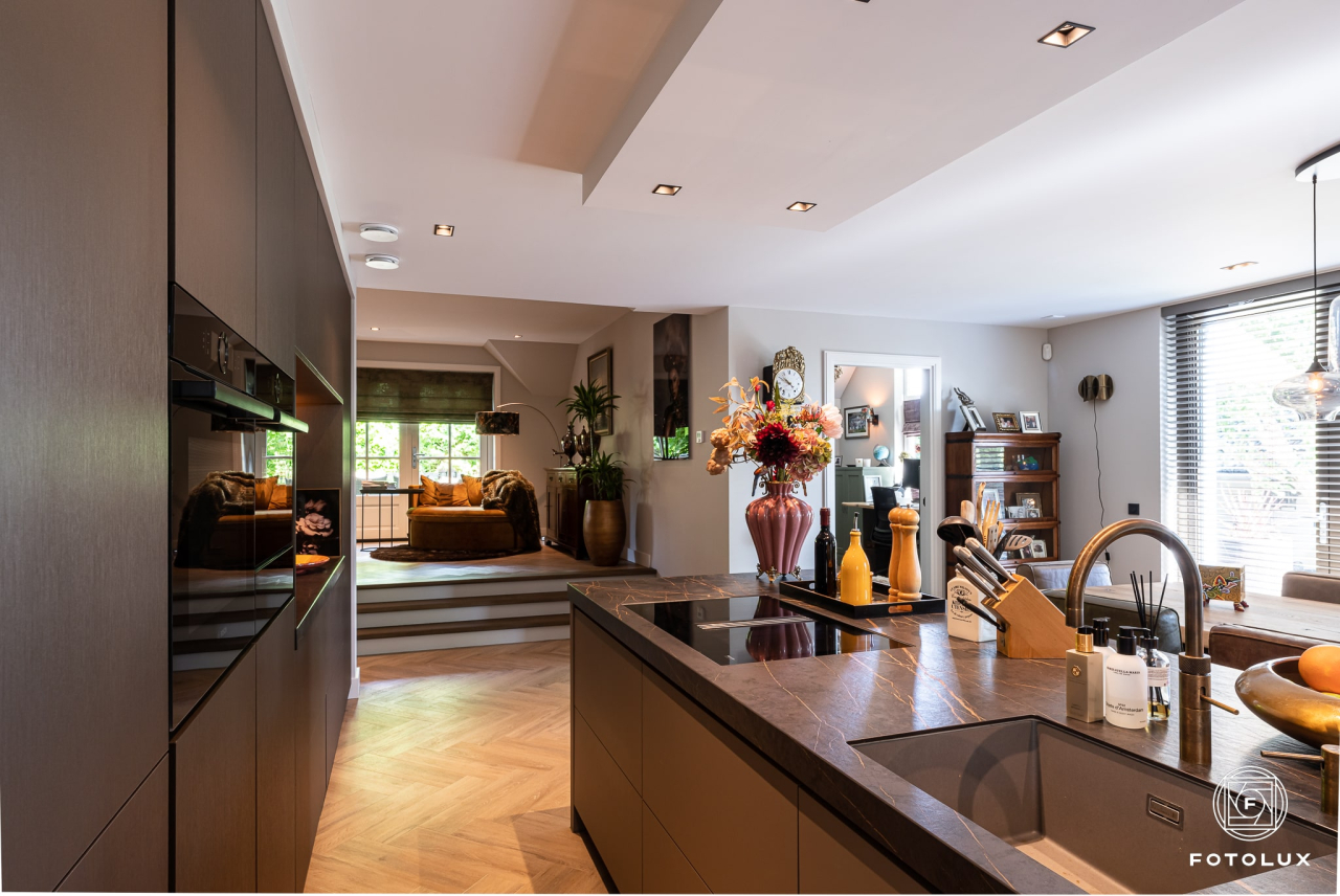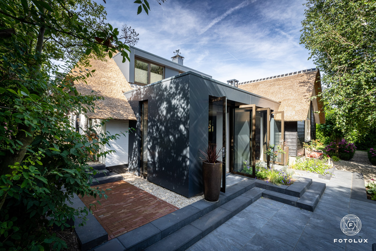 De boerderij is in z’n oude glorie herstelt en tegelijkertijd vergunningvrij uitgebreid met een uitbouw en dakkapel. De uitbouw is voorzien van de strakke gevelbekleding Alucopal van Plastica. En die vormt dan weer een perfect contrast met de bronskleurige aluminium kozijnen van de schuifpui.