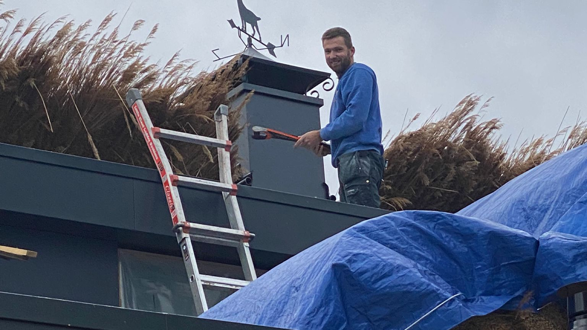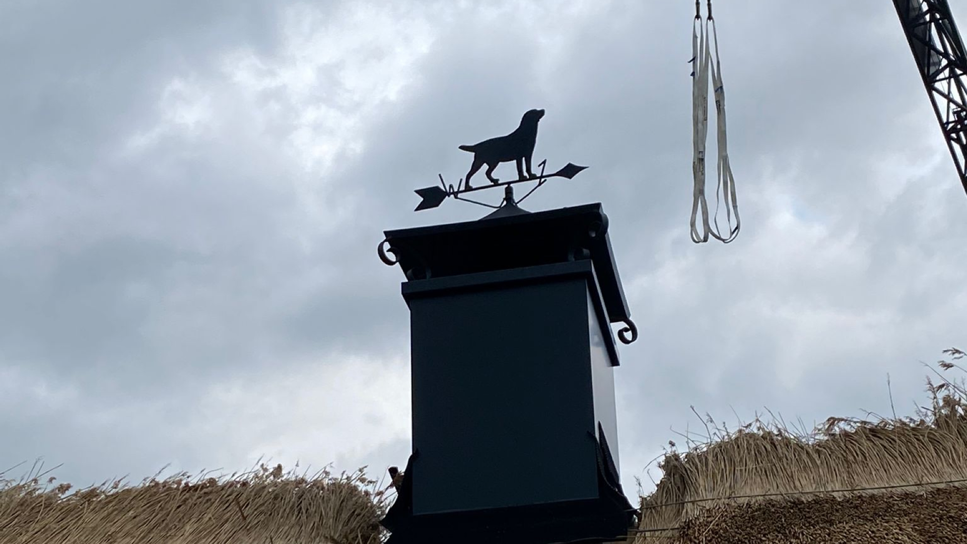 De nieuwe prefab schoorsteen vormt de basis en daaroverheen plaatsten we de gestraalde en gepoedercoate kap en windwijzer. Zo komen oud en nieuw perfect samen.